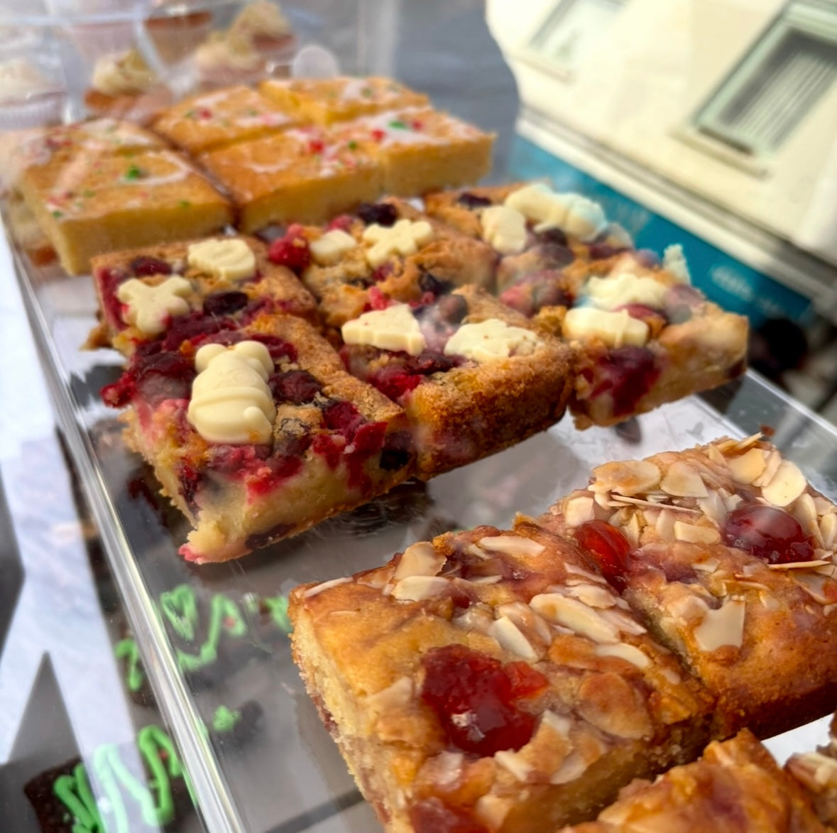 Cherry Bakewell - Contains: Eggs, Milk and Nuts. May Contain Peanuts, Soya, Sesame Seeds.