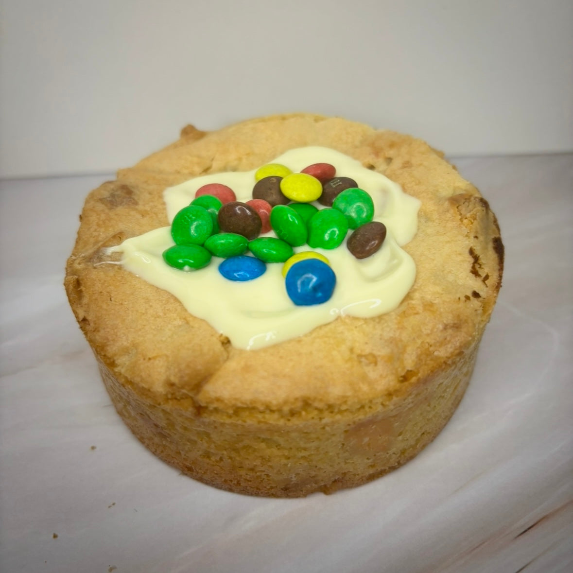 Milky bar and M&M Mini Cookie Pie. 4 inch. Serves about 4.